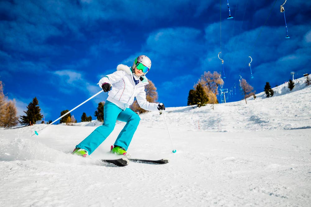 2.滑雪基本姿势:双膝微曲。眼自然平视远方而不要盯着自己的雪板尖看。重心向前而不要向后,小腿要向前用力压紧雪靴。双手握雪杖向前举起,双肘微曲。初学者不要把手套在杖柄的绳套内。